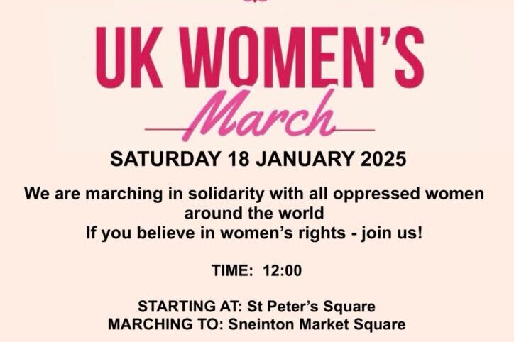 SATURDAY 18 JANUARY 2025 UK Women’s March are marching in solidarity with all oppressed women around the world. If you believe in Women’s rights – please join them! TIME: 12.00pm…